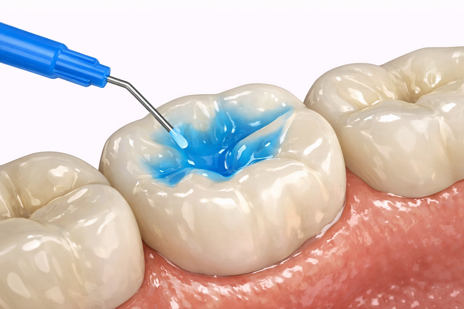 A gentle conditioning gel is applied briefly to help the sealant bond.Applying the sealant material