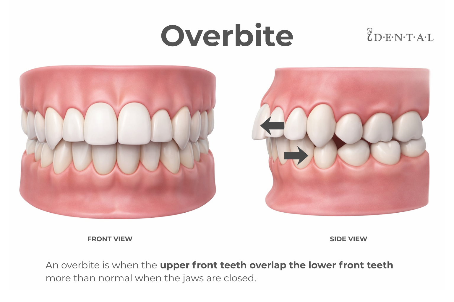 An overbite happens when the upper front teeth overlap the lower front teeth. A small amount of overlap is normal. It becomes a concern when the overlap is excessive, especially if it causes functional problems or tooth wear.