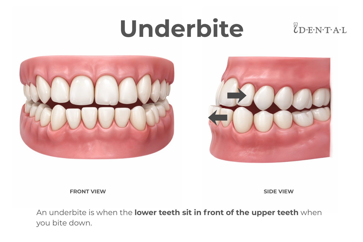An underbite happens when the lower front teeth sit in front of the upper front teeth when you bite down. Underbites can be mild or more pronounced and may be linked to jaw growth patterns.